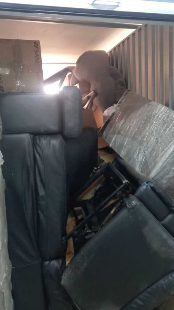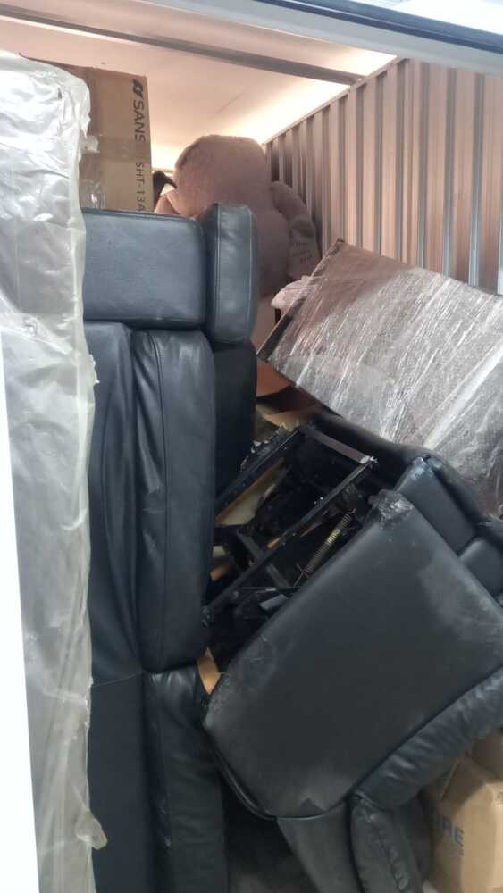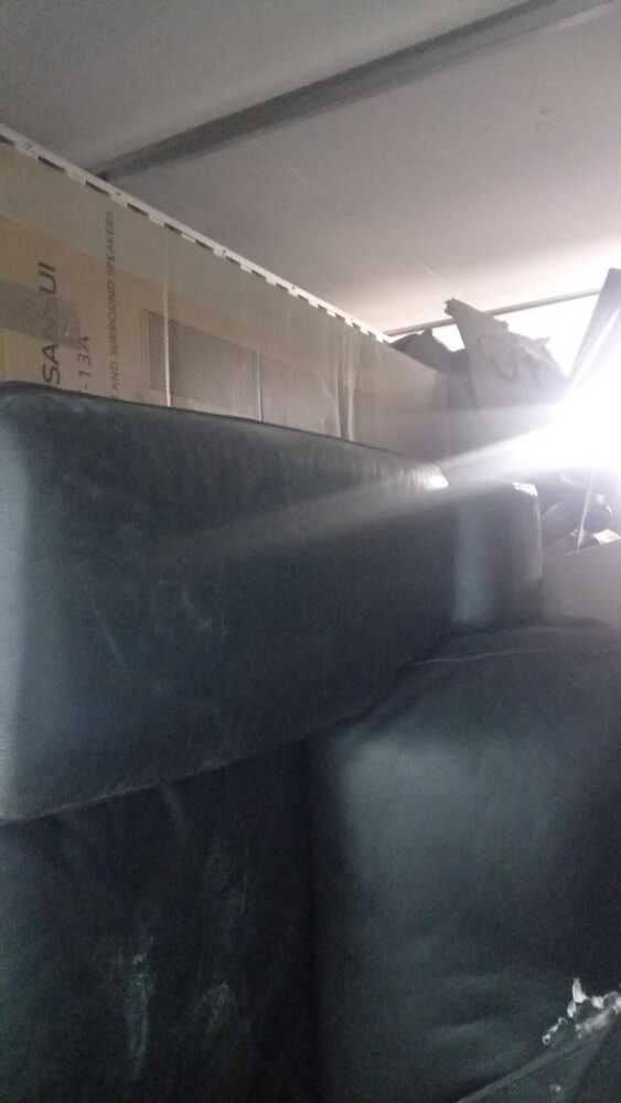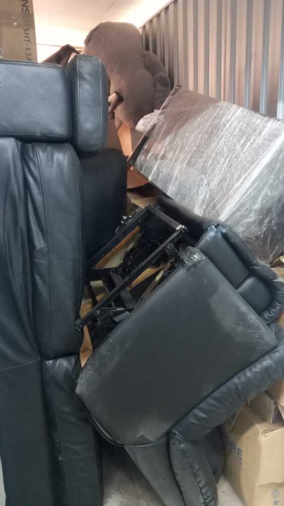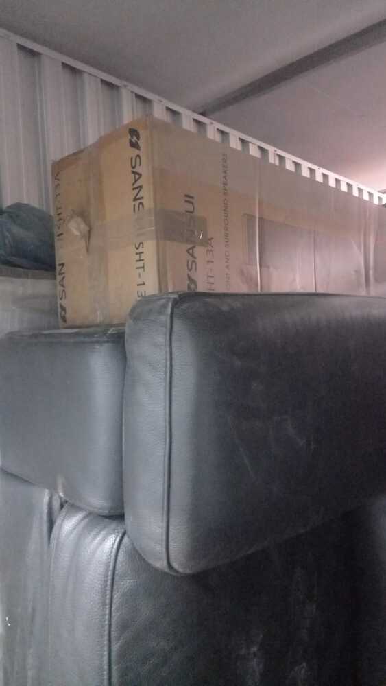 Household content with leather couch set and many boxes with random items.